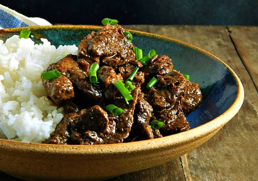 Rendang is a slow-cooked dry curry from West Sumatra, Indonesia, often named one of the world’s most delicious dishes. Beef is simmered for hours in coconut milk and a complex spice paste (lemongrass, galangal, ginger, chilies) until the sauce reduces to a dark, tender caramelized coating.