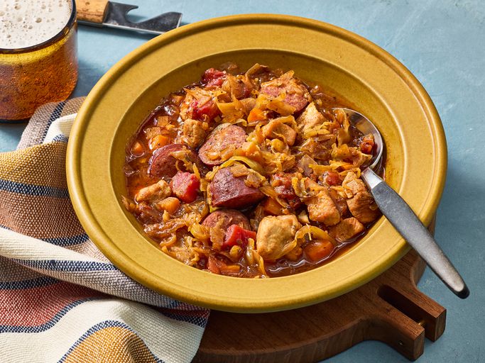 Bigos (pronounced bee-gohss) is a deeply flavored, hearty Polish stew made from a mix of fresh and fermented cabbage (sauerkraut), various cuts of meat (often pork, sausage, and bacon), and forest ingredients like wild mushrooms and juniper berries. It is famously better the next day, and often simmered over multiple days.