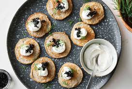 - Assembly: Spread a thin layer of sour cream onto the Blini. Add slices of smoked salmon and a spoonful of red caviar. Roll or fold the Blini into quarters and garnish with dill.