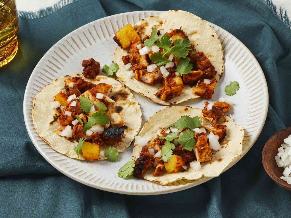 - Assemble: Warm the corn tortillas on a comal or skillet. Chop the cooked chicken into small pieces. Serve the chicken in the warm tortillas, topped with the warm, charred pineapple, a sprinkle of chopped onion and cilantro, and a generous squeeze of lime juice.