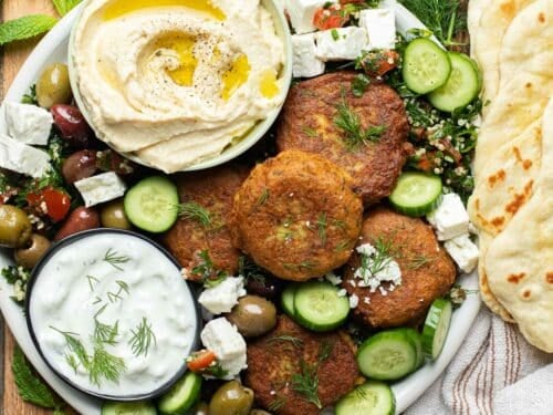 6. Arrange falafel on platter with hummus, tahini, pita, and salad.