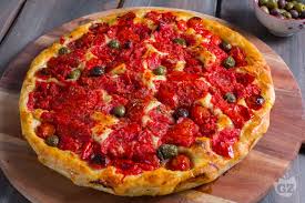 Focaccia Barese is the signature style of focaccia from Bari, Puglia. It is known for its high hydration, soft, dimpled interior, and a unique topping of tomatoes, oregano, and olives. The dough often incorporates a small amount of boiled potato, which keeps the crumb tender and moist.