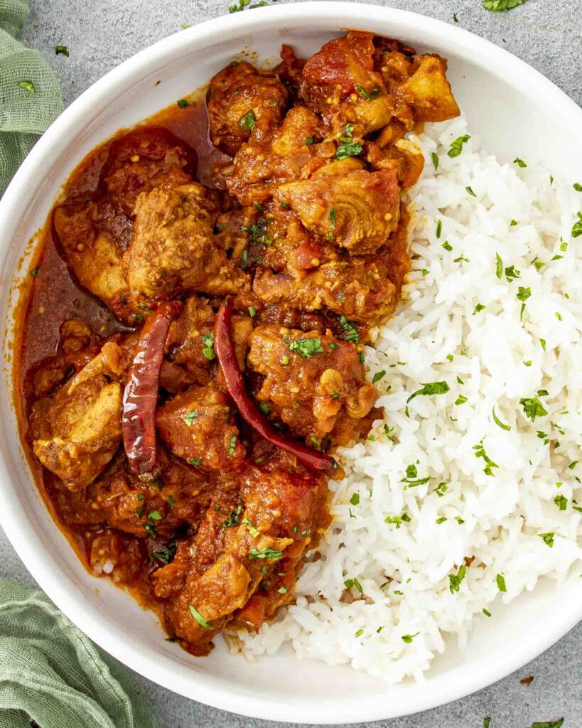 - Serve: Adjust salt and vinegar to taste. Serve hot with Basmati rice and cooling raita.