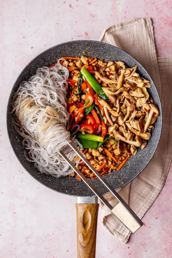 - Noodles: Boil the dangmyeon noodles according to package directions until fully tender (usually about 8 minutes). Drain, rinse in cold water, and cut them with scissors into shorter strands. Toss lightly with 1 tsp of sesame oil to prevent sticking.