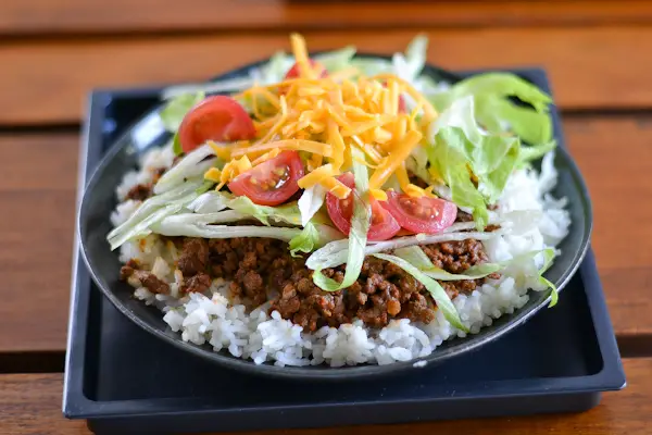 The dish was invented by a chef named Matsuzo Gibo at his café, Parlor King Tacos, near the U.S. military base in Kin, Okinawa. Gibo sought a filling and affordable meal for the American military personnel who frequented the area. He replaced the traditional tortilla with a bed of Japanese white rice and topped it with a heavily seasoned, savory ground beef mixture, shredded cheese, lettuce, tomato, and a generous drizzle of salsa or chili sauce.